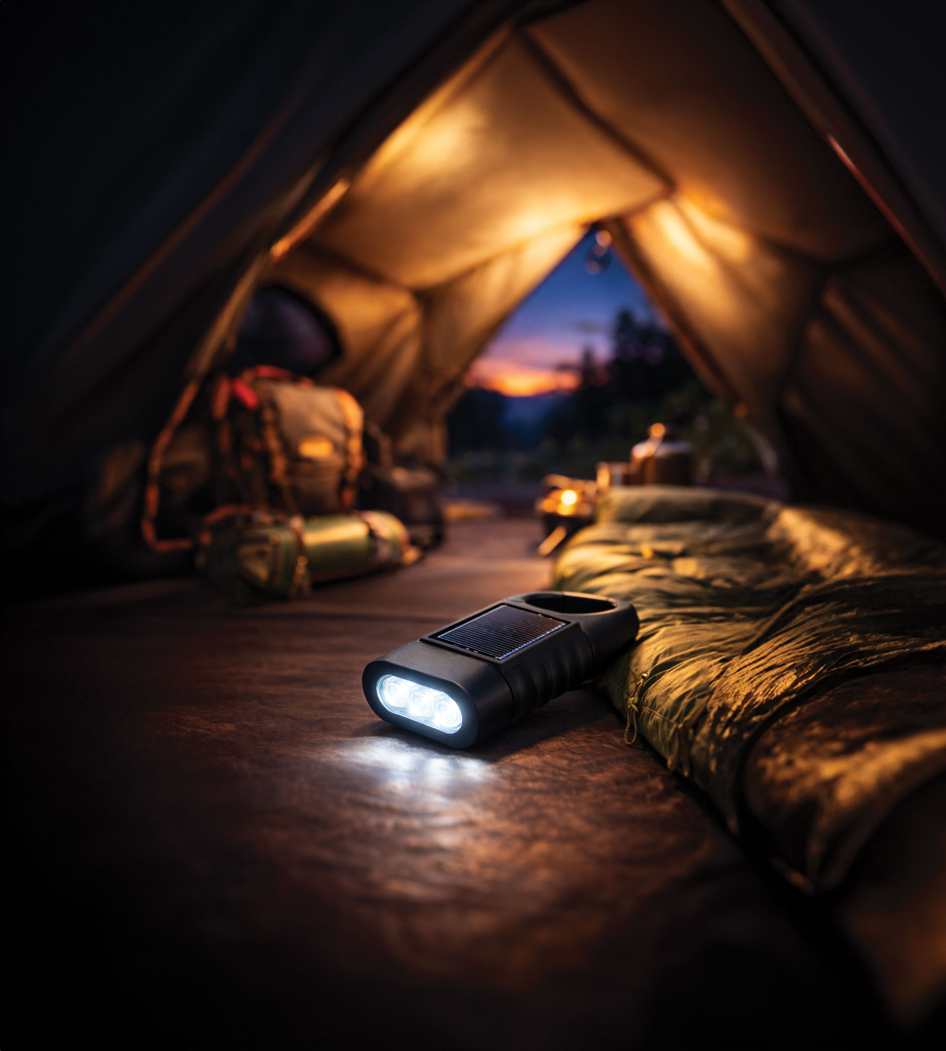 Solar panel, manyetolu el krankı ve USB-C hızlı şarj desteği ile üç farklı enerji kaynağıyla şarj edilebilir. Kompakt, dayanıklı gövdesi ve askı karabinası sayesinde kolay taşınabilir ve asılabilir süper parlak led ışık.
